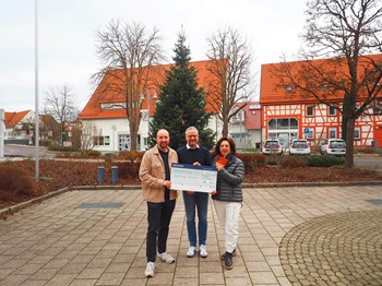Foto (Stadt Uhingen): Simon Frey (links) und Sylvia Kneer überreichen den Spendenscheck an Matthias Wittlinger zugunsten der Bürgerstiftung.