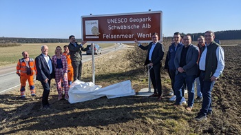 Der UNESCO Global Geopark Schwäbische Alb,der in diesem Jahr sein 10-jähriges Bestehen feiert,ist nun im Ostalbkreis nicht mehr zu übersehen. Erstmals wurden zwei Hinweisschilder installiert,die den UNESCO Global Geopark Schwäbische Alb kenntlich machen: Zum einen an der Bundesstraße B29 auf der Höhe des Abzweigs Aalen-Wasseralfingen und zum anderen an der Landesstraße L1165 zwischen Wental und Bartholomä. Diese sogenannten touristischen Unterrichtungstafeln,vergleichbar mit denen an Autobahnen,rücken die geologische Einzigartigkeit der Region in den öffentlichen Fokus. Bei strahlendem Sonnenschein fand die feierliche Einweihung im Beisein des Landrats des Ostalbkreises,Dr. Joachim Bläse,Geopark-Vorstand Ulrich Ruckh sowie weiterer Vertreter aus Politik und Tourismus statt.