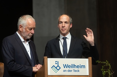 Einem musikalischen Zwischenspiel folgend gab es weitere Grußworte. Den Gruß und die besten Wünsche der BürgermeisterInnen der Verwaltungsgemeinschaft Weilheim überbrachte Bürgermeister Florian Schepp aus Holzmaden. Der geschäftsführende Schulleiter der Weilheimer Realschule Robin Fehmer ergriff das Wort für alle Weilheimer Schulen. Für die Kirchen sprach Pfarrer Matthias Hennig von der Evangelischen Kirchengemeinde Weilheim. Für die örtlichen Vereine sprach TSV-Vorstand Andreas Klöhn. Hauptamtsleiterin Daniela Braun und Stadtbaumeister Jens Hofmann sprachen im Namen aller Mitarbeiterinnen und Mitarbeiter der Stadtverwaltung.