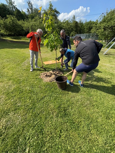 Der Baum wurde von Landrat Wolff anlässlich des Festakts zum Jubiläumsjahr überreicht und seither vom Bauhof der Gemeinde in besonderer Weise gehegt. Vier Wochen lang wurde das junge Gehölz umsorgt und gepflegt,bis nun der passende Zeitpunkt für die Pflanzung gekommen war.