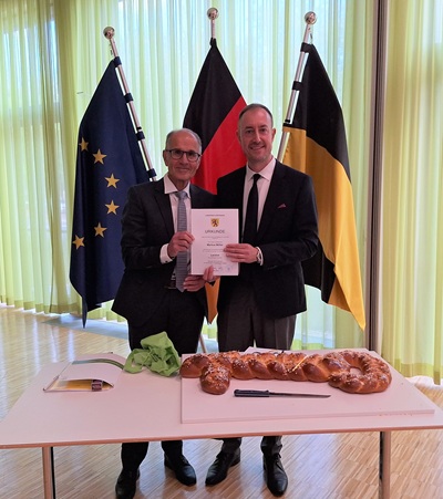 Nach der Wahl am 4. April 2025 erhielt Herr Markus Möller heute in der öffentlichen Kreistagssitzung die Ernennungsurkunde vom 1. stellvertretenden Vorsitzenden des Kreistags,Kreisrat Wolfgang Rapp,überreicht. Mit dieser Urkunde ist nun Markus Möller ab 1. Juli 2025 der neue Landrat des Landkreises Göppingen. Als symbolisches Geschenk wurde Markus Möller ein Hefezopf in Schlüsselform von Vertretern des Kreistags übergeben. Zuvor hatte der Kreistag über die Einweisung des neuen Landrats in die Besoldungsgruppe B8 beschlossen.