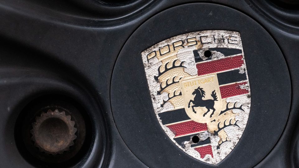 Das Logo von Porsche auf einer Felge