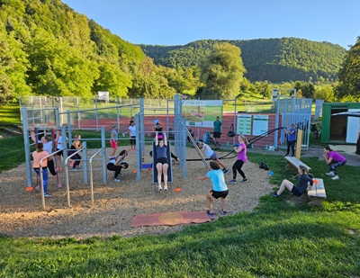 Von 18 bis 19 Uhr hieß es: Energie tanken und ins Schwitzen kommen! Ob Full-Body-Workout,Hula-Hoop,Yoga,Zumba oder HIIT – jede Einheit sorgte für Abwechslung und gute Laune. Der neue Kursort im FiTal-Park erwies sich dabei als großer Gewinn: Mehr Teilnehmerinnen und Teilnehmer als in den Vorjahren auf der Sonnenterrasse des Hauses des Gastes fanden hier Platz. Im Durchschnitt waren es rund 40 Sportbegeisterte,die das Angebot regelmäßig nutzen – ganz ohne Anmeldung,einfach spontan zum Mitmachen. Hartplatz und Tartanbahn boten ideale Trainingsflächen und wer nach einer intensiven Einheit Abkühlung suchte,konnte direkt ins Kneippbecken steigen. Je nach Wetterlage entschieden die Kursleiterinnen flexibel über den Ort: Bei Regen wurde kurzerhand das schützende Vordach der Hiltenburgschule genutzt.
