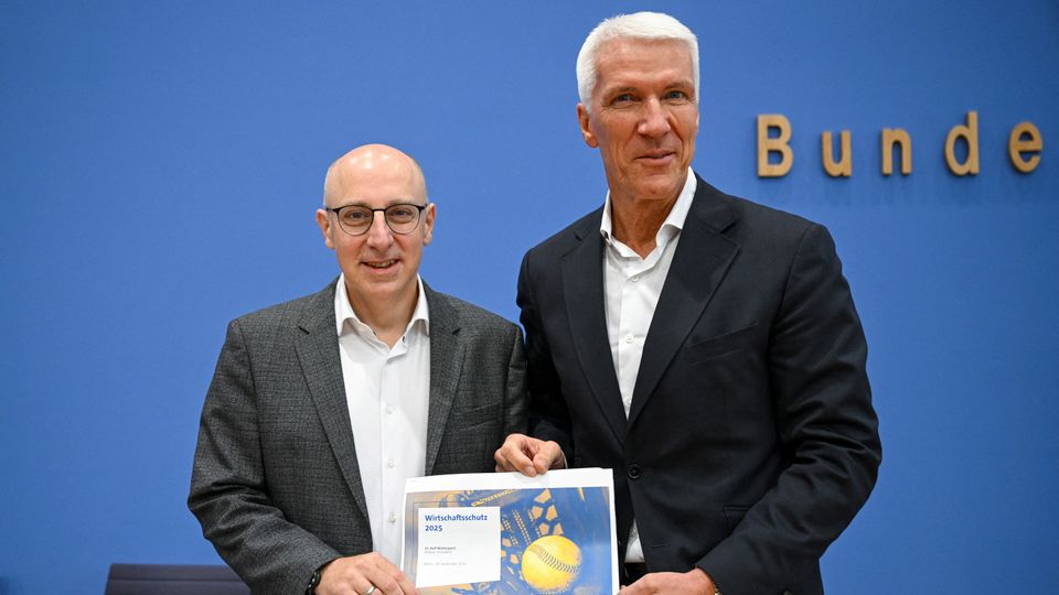 Bitkom-Präsident Ralf Wintergerst (rechts) und der künftige Präsident des Bundesamts für Verfassungsschutz,Sinan Selen (links),stellten gemeinsam den Bericht vor