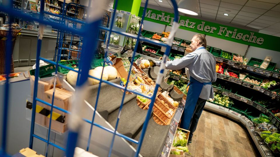 Ein Mitarbeiter füllt in der Gemüseabteilung ein Regal auf (Symbolbild)