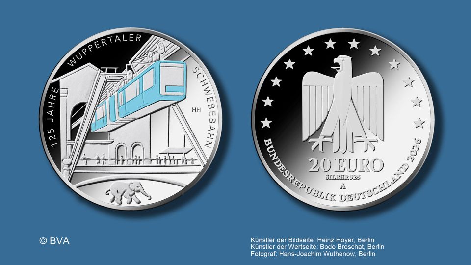 Die Wuppertal-Münze sollte ursprünglich im kommenden Jahr erscheinen,wenn die Schwebebahn den 125. Jahrestag ihrer Inbetriebnahme feiert. Die bereits vorgestellte Münze zeigte nicht nur einen Bundesadler,umrahmt von Sternen,sondern auch eine farbige Darstellung der weltbekannten Bahn – sowie klein und am Münzenrand den Elefanten Tuffi,der 1950 aus dieser stürzte.