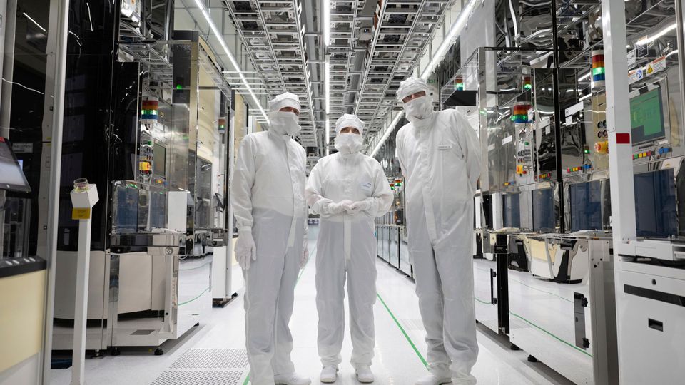 Bundeswirtschaftsministerin Katherina Reiche (Mitte) mit Sachsens Ministerpräsident Michael Kretschmer (links) und Infineon-Chef Jochen Hanebeck im Reinraum einer Chipfabrik