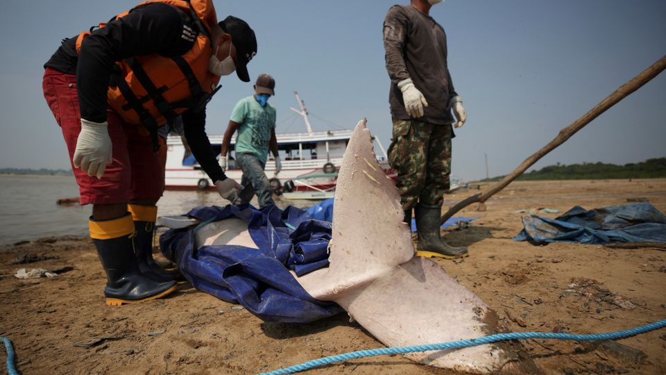 Forscher bergen einen toten Delfin am Ufer des Sees von Tefé (Oktober 2023)