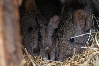 Potoroos sind in der Natur eher nachtaktiv. Da sie in Zoos keinem Druck von Fressfeinden unterliegen,passen sie sich dort meist aber auch einem anderen Tagesrhythmus an. In der Wilhelma sind zwei Paare der kleinen Känguruart zu Hause: Eines teilt sich eine Anlage mit dem Goodfellow-Baumkänguru. Das Paar,bei dem es zu Nachwuchs gekommen ist,lebt momentan hinter den Kulissen. Das Jungtier wurde nach 38 Tagen Tragzeit bereits im August geboren und hat den Beutel nun im Alter von rund 250 Tagen verlassen. Grundsätzlich können Potoroo-Weibchen mit Jungtieren sehr schnell neu trächtig werden. In dem Fall tritt zunächst eine Keimruhe ein. Der Embryo entwickelt sich erst dann weiter,sobald sein Geschwisterchen den Beutel verlassen hat.
