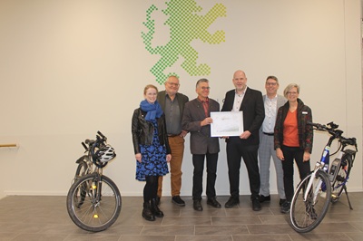 Das Landratsamt nimmt seit 2011 regelmäßig am Zertifizierungsprozess des ADFC teilt. Erneut konnte die Punktzahl bei der Bewertung gesteigert werden. Verbesserungen bei den Stellplätzen und Reparaturmöglichkeiten waren dafür maßgeblich. Der Gold-Status als Fahrradfreundlicher Arbeitgeber wurde dadurch gesichert,nahe an der Schwelle zur erreichbaren Höchstpunktzahl. Die Urkunde mit dem neuen Zertifikat in Gold wurde am Freitag im Rahmen einer kleinen Feierstunde mit allen Beteiligten im Foyer des Landratsamts von Martin Hulin übergeben.