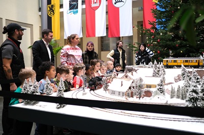 Mit einer stimmungsvollen Eröffnung ist am Freitag,5. Dezember,die weihnachtliche Märklin-Modelleisenbahn im Atrium des Rathauses in die Adventszeit gestartet. Auf einer Fläche von 2,6 mal 4,2 Metern lädt die liebevoll gestaltete Anlage Besucherinnen und Besucher zum Verweilen und Staunen ein.