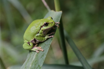 Der Europäische Laubfrosch (Hyla arborea) ist der einzige Baumfrosch hierzulande. Mit seinen Saugnäpfen an Finger- und Zehenspitzen kann er Baumwipfel in über 20 Meter erreichen. Seine bevorzugte Beute jagt er mit der klebrigen Zunge: Käfer,Spinnen und Fliegen. Die typische grüne Färbung mit dem dunklen Flankenstreif sowie die lautstarken Rufe zur Paarungszeit im Schutz der Nacht machen die Froschart unverwechselbar. Laubfrösche sind zugleich die kleinste Art unserer heimischen Frösche: zwischen drei bis fünf Zentimeter und nicht mehr als sechs Gramm wiegend,können sie in ihren Habitaten leicht übersehen werden.