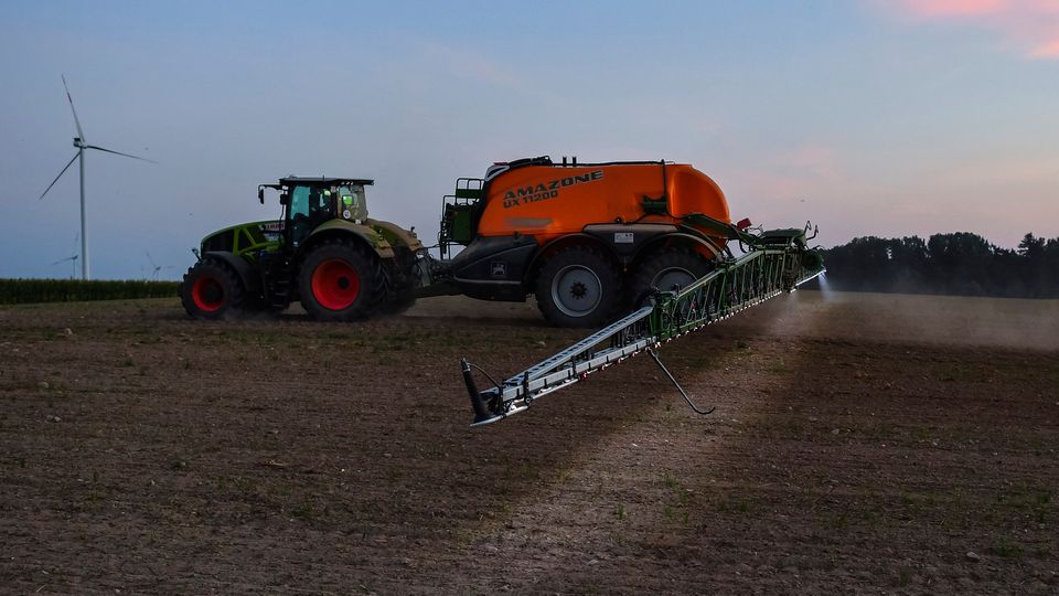 Ein Landwirt fährt mit einer Pestizidspritze über ein Feld