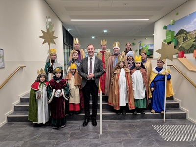 Landrat Markus Möller hat die Sternsinger aus mehreren Göppinger Kirchengemeinden im Landratsamt begrüßt. Die Kinder und Jugendlichen überbrachten mit Liedern,Segenswünschen und dem traditionellen Kreidezeichen ihre guten Wünsche für das neue Jahr. Landrat Möller bedankte sich für den Besuch und würdigte den Einsatz der Sternsinger zugunsten anderer Kinder weltweit.