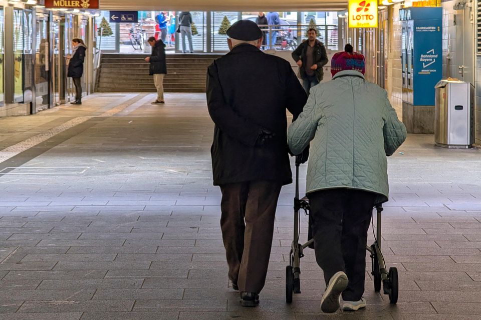 Ein älteres Ehepaar läuft durch eine Unterführung in München