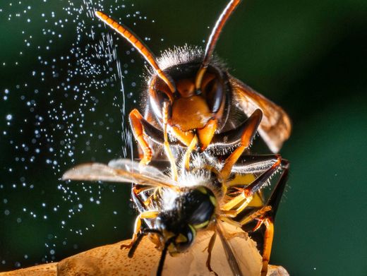 Asiatische Hornisse (oben) beim Verspeisen einer Wespe