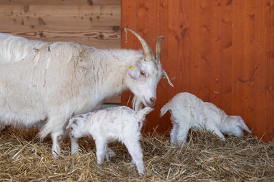 Die kleinen Ziegen präsentieren sich bereits wenige Tage nach der Geburt aufmerksam und neugierig. Beide Zicklein haben ein dichtes,weißes Fell. Wie für Ziegen typisch,folgen sie ihren Müttern eng und erkunden zunehmend eigenständig ihre Umgebung,wobei sie spielerisch ihre Koordination und Trittsicherheit entwickeln.