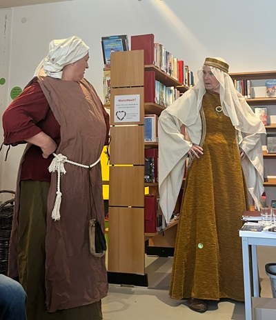 Die Autorin las nicht nur Passagen aus ihrem Buch „Barbarossa und das Waschweib“ vor,sie schlüpfte auch in die Rolle einer Hofdame und führte,zusammen mit Sandra Zagora (als Waschweib),humorvolle Szenen vor. So gewannen die Gäste einen kleinen,lebendigen Eindruck von vergangenen Zeiten.