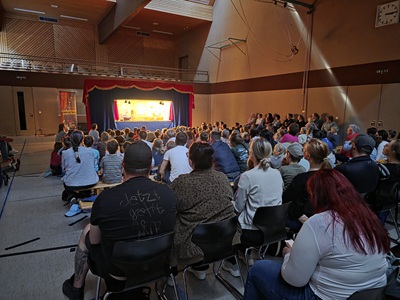Zahlreiche Familien mit Kindern verfolgten die rund einstündige Vorstellung mit großer Aufmerksamkeit. Besonders erfreulich war die lebendige Beteiligung der jungen Zuschauer/-innen,die das Geschehen auf der Bühne immer wieder mit Rückfragen,Kommentaren und Zwischenrufen begleiteten.