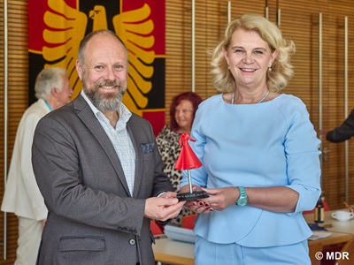 Dass ihr Auftritt mehr war als ein routinierter Pflichttermin,zeigte sich auch abseits der Rede. Persönliche Gesten verliehen dem Besuch eine ganz besondere Note: Für den scheidenden Oberbürgermeister Klaus Heininger brachte sie ein individuell gewidmetes Buch mit,das sie im Beisein seines Vorgängers Günther Frank an Heininger überreichte. CDU-Stadtverbandschef Axel Raisch erhielt Produkte aus ihrer eigenen Imkerei – Honig und Johannisbeerlikör.